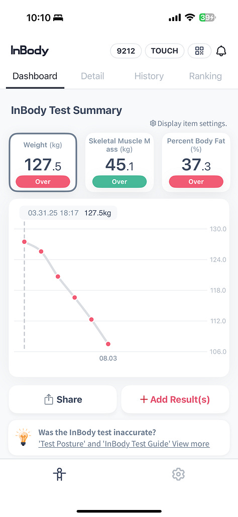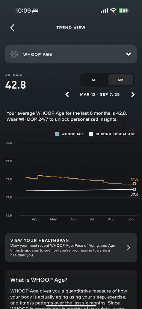 My biological age on WHOOP is dropping toward my actual age. I am pushing toward sub-100kg and ideally the mid-90s at 187 cm, which is a much healthier range.