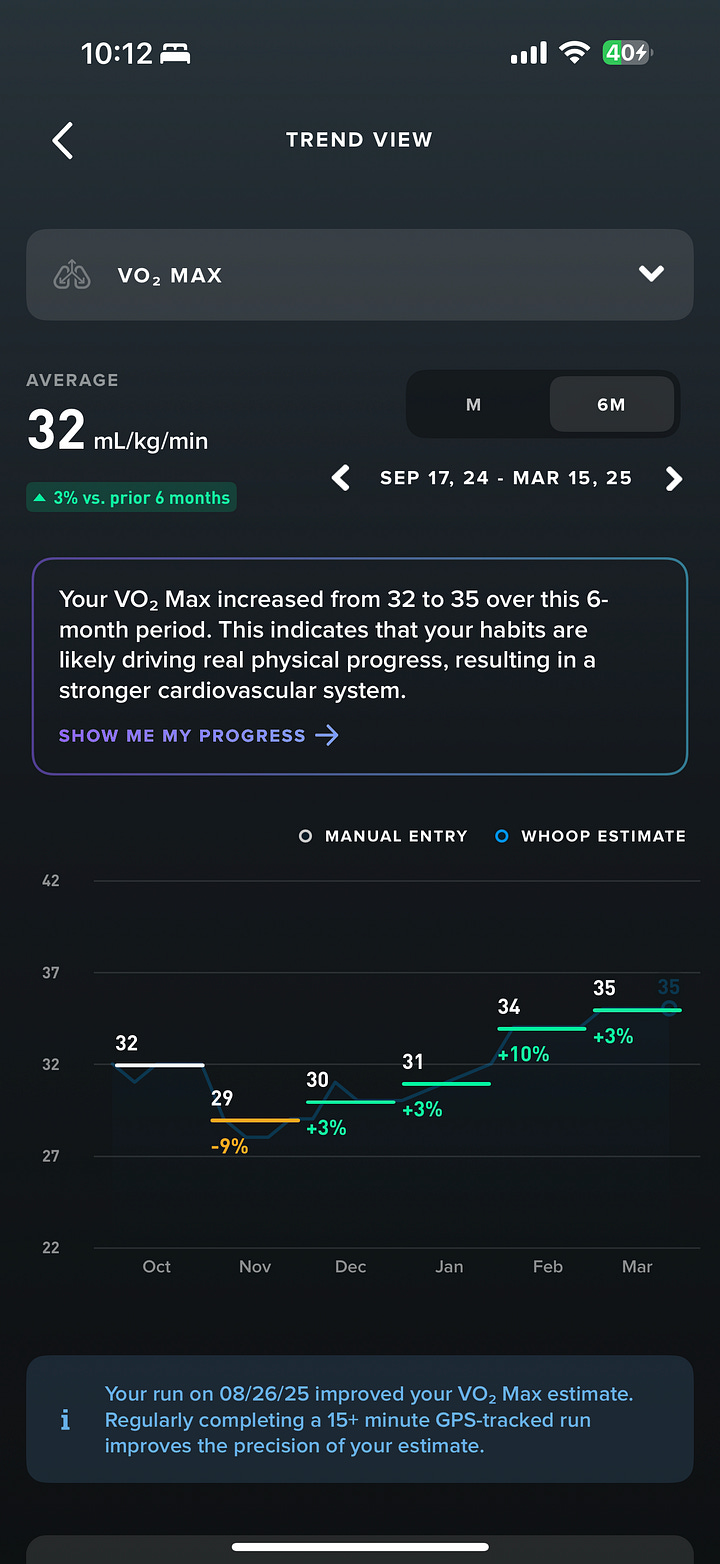 I did a VO2 max test in Chile in December 2024 and finished with a 28 ml/kg/min on lab CPET and mirrored by WHOOP - very low for a 38-year-old male.